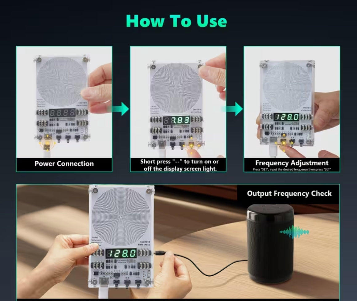 This sleek, minimalist device delivers the same selectable frequency technology as our larger generators, in a smaller, more portable form. Perfect for bedside tables, workspaces, travel, or anywhere you want to gently reset your environment.